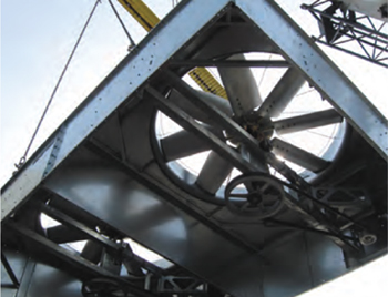 風(fēng)扇延伸風(fēng)筒可保證出風(fēng)測(cè)的氣流不受阻擋,保障冷卻塔提供最大的處理能力。當(dāng)閉式塔無(wú)法高出附件結(jié)構(gòu)時(shí),有必要加裝風(fēng)扇延伸風(fēng)筒保證將熱空氣排出冷卻塔,避免因?yàn)闅鈮汉透郊咏Y(jié)垢的共同作用導(dǎo)致熱控?zé)峥諝鈱?duì)吸入冷空氣進(jìn)行干擾。