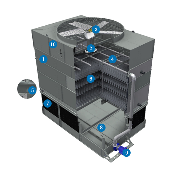 有兩種選項(xiàng),一是冷水盤采用304/316不銹鋼材質(zhì),而其它結(jié)構(gòu)和面板采用G235鍍鋅鋼;另外就是全塔結(jié)構(gòu)包括冷水盤在內(nèi)的所有結(jié)構(gòu)和面板均采用304/316不銹鋼材質(zhì)。