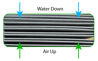 Better water coverage around the tubes is due to air and spray water flowing in fl smooth,parallel,downward path over the condensing coil,maintaining full tube coverage.This parallel flow eliminates scale-promoting dry spots since the water is not stripped from tile underside of the tubes by the airflow. |