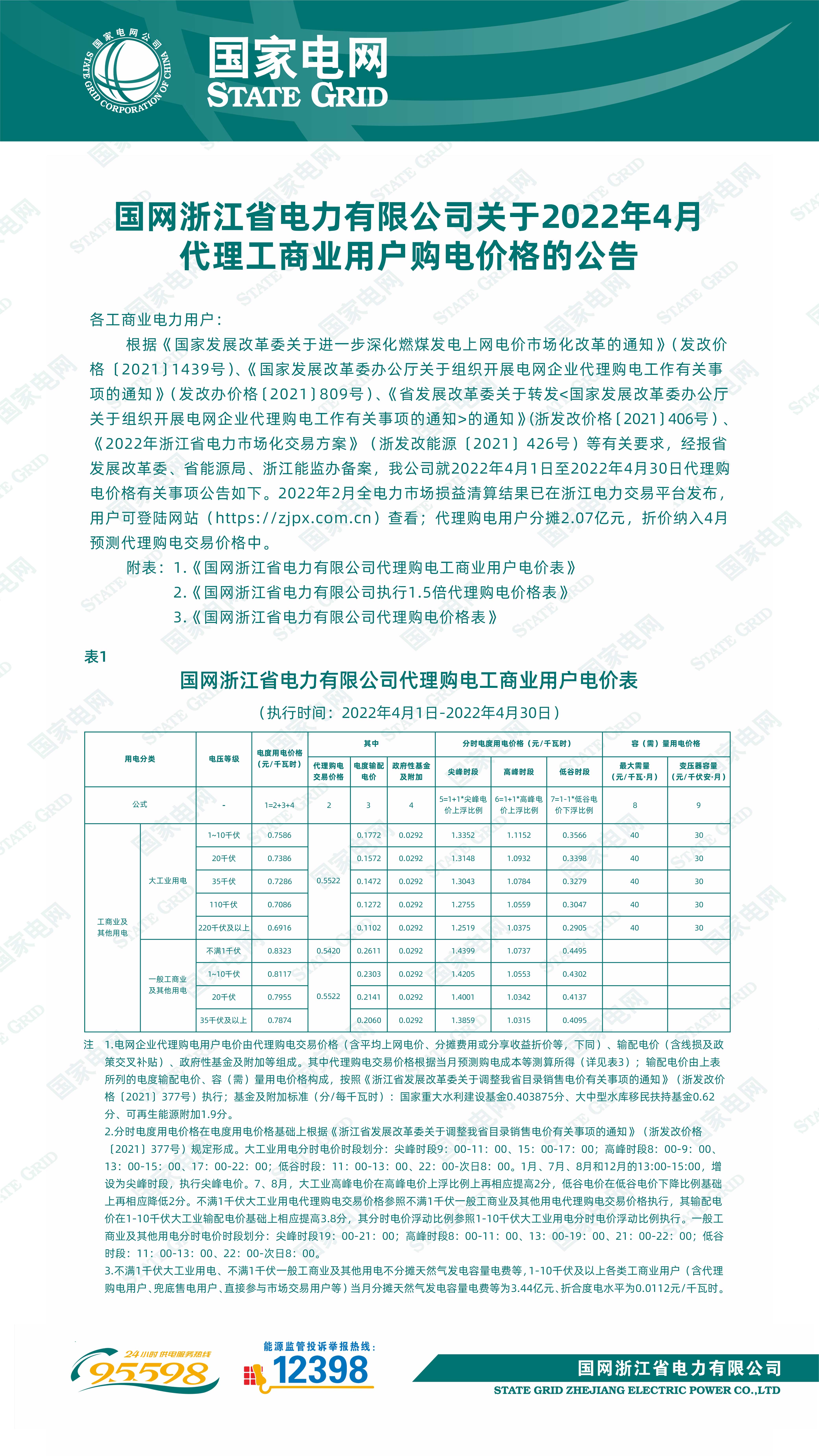 國網浙江省電力有限公司關于2022年4月代理工商業用戶購電價格的公告