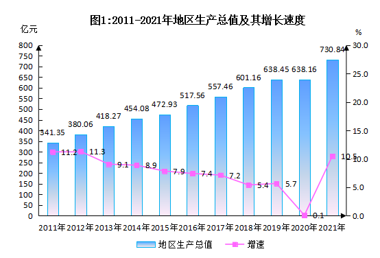 初步核算,2021年全市地區(qū)生產(chǎn)總值[2]730.84億元(見(jiàn)圖1),按可比價(jià)計(jì)算,比上年增長(zhǎng)10.5%。其中,第一產(chǎn)業(yè)增加值18.75億元,第二產(chǎn)業(yè)增加值328.73億元,第三產(chǎn)業(yè)增加值383.35億元,增速分別為1.8%、11.1%、10.5%。三次產(chǎn)業(yè)結(jié)構(gòu)為2.6:45.0:52.5。按戶籍人口計(jì)算,全市人均生產(chǎn)總值85849元(按年平均匯率折合13307美元),比上年增長(zhǎng)10.5%。按常住人口計(jì)算,全市人均生產(chǎn)總值67120元,比上年增長(zhǎng)9.4%。