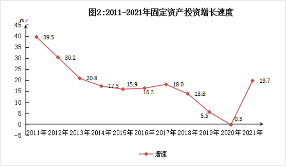 2021年,全市固定資產(chǎn)投資比上年增長(zhǎng)19.7%(見(jiàn)圖2)。其中,高新技術(shù)產(chǎn)業(yè)投資增長(zhǎng)59.3%,民間投資增長(zhǎng)29.1%,交通運(yùn)輸投資增長(zhǎng)45.3%,生態(tài)保護(hù)和公共設(shè)施投資增長(zhǎng)15.5%。全年房地產(chǎn)開(kāi)發(fā)投資增長(zhǎng)9.9%,其中住宅投資增長(zhǎng)6.9%。房地產(chǎn)開(kāi)發(fā)企業(yè)全年房屋施工面積增長(zhǎng)9.2%,其中新開(kāi)工面積增長(zhǎng)51.7%。房屋竣工面積下降42.7%。全年商品房銷(xiāo)售面積下降0.8%,其中住宅銷(xiāo)售面積下降7.5%;商品房銷(xiāo)售額增長(zhǎng)7.5%,其中住宅銷(xiāo)售額與去年同期持平。