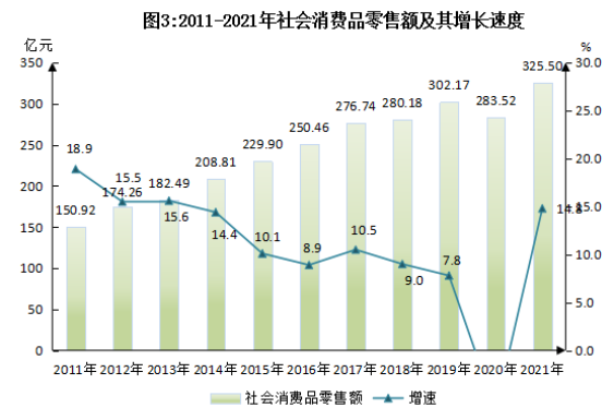 全年社會(huì)消費(fèi)品零售總額325.50億元,比上年增長(zhǎng)14.8%(見(jiàn)圖3),其中限額以上社會(huì)消費(fèi)品零售額63.64億元,比上年增長(zhǎng)13.8%。分城鄉(xiāng)看,城鎮(zhèn)市場(chǎng)零售額283.51億元,增長(zhǎng)14.7%;鄉(xiāng)村市場(chǎng)零售額41.98億元,增長(zhǎng)15.4%。按消費(fèi)形態(tài)分,商品零售收入295.61億元,增長(zhǎng)14.8%,餐飲收入29.89億元,增長(zhǎng)14.8%。