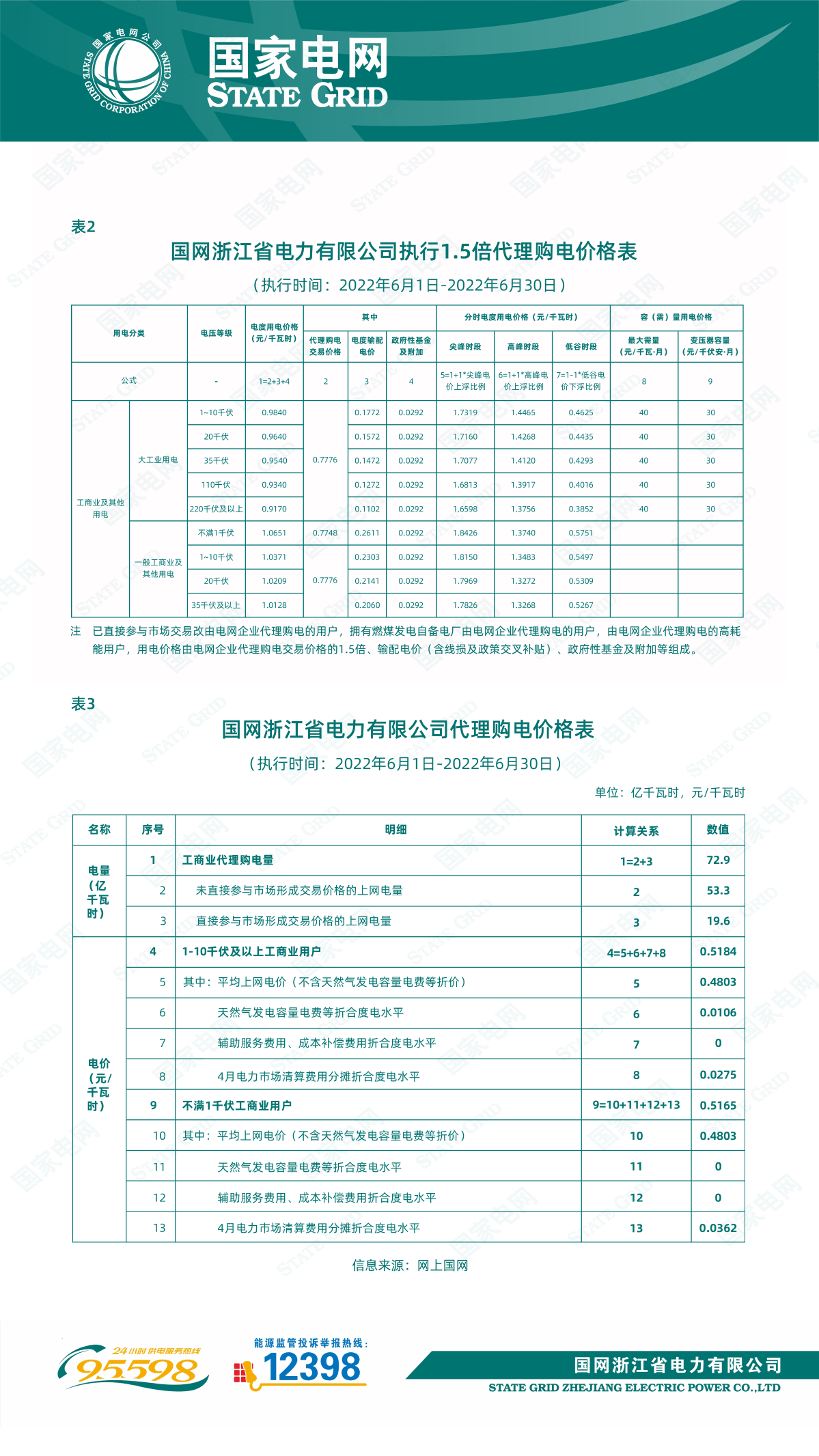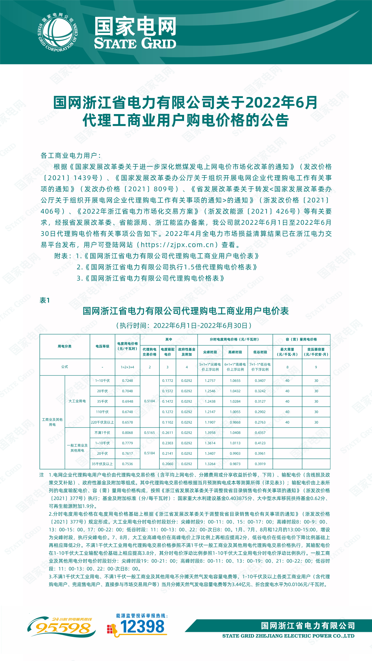 國網浙江省電力有限公司關于2022年6月代理工商業用戶購電價格的公告