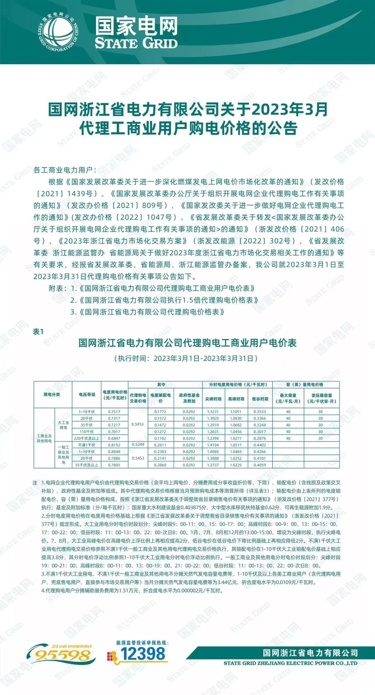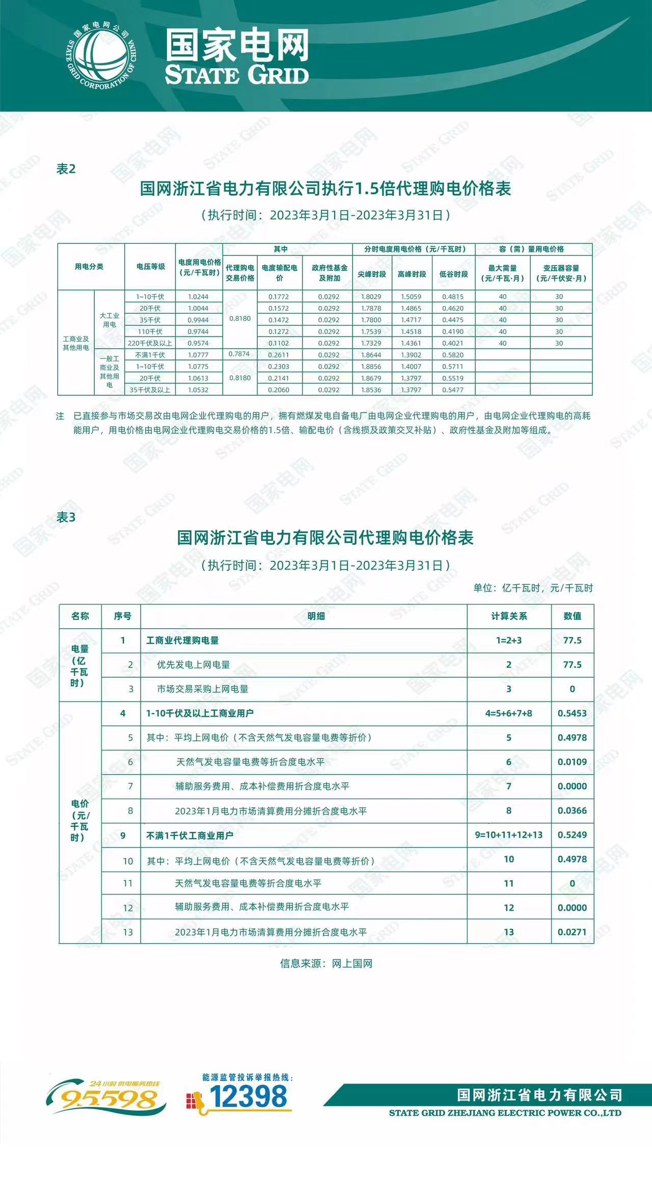 國(guó)網(wǎng)浙江省電力有限公司關(guān)于2023年3月代理工商業(yè)用戶購(gòu)電價(jià)格的公告