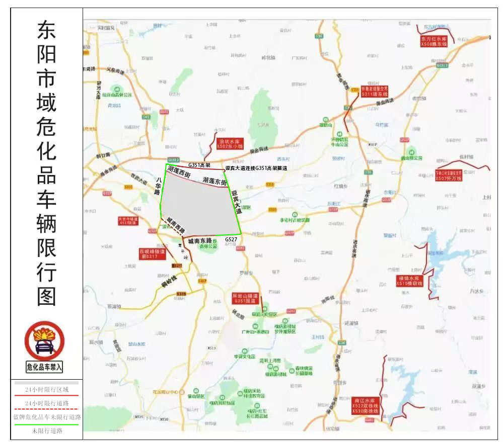 所有危化品運(yùn)輸車城區(qū)范圍限行區(qū)域道路,由廣福路向北調(diào)整至湖蓮東街、湖蓮西街,臨界道路(湖蓮東街、湖蓮西街)、G351國道高架(迎賓大道至湖田)及迎賓大道連接隧道全天24小時限制通行。